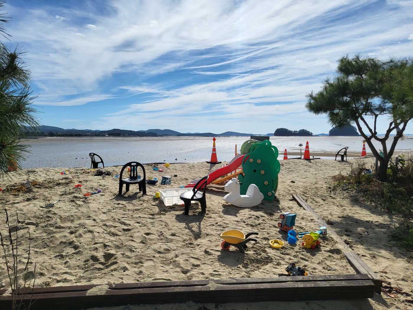 해비치하우스 펜션의 또 다른 매력은 바로 앞에 있는 갯벌입니다. 우리 가족은 아침 8시쯤 물이 빠진 갯벌에서 특별한 체험을 했어요. 아이들은 갯벌에서 조개를 찾으며 즐거워했고, 어른들은 자연의 신비로움을 느낄 수 있었습니다. 갯벌 체험 후에는 펜션에서 제공하는 간단한 세척 시설을 이용해 씻을 수 있어 편리했어요. 객실로 돌아와 샤워를 하고 휴식을 취하기에도 좋았습니다.